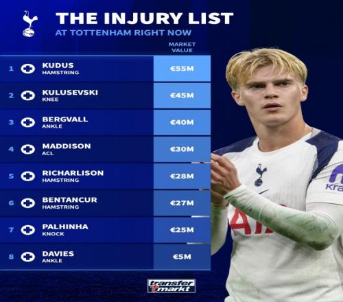 体育播报1月23日宣 德国转会市场列出了热刺伤员的身价排名,库杜斯5500万欧居首,库卢塞夫斯基4500万欧次席。